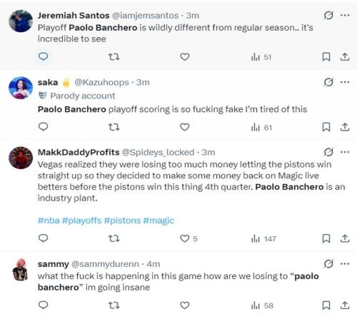 已经有球迷表示,班凯罗季后赛的表现跟他常规赛判若两人。更有活塞的球迷认为班凯罗季后赛的表现太假了,如果魔术爆冷赢球联盟应该审查班凯罗。(前三节小瓦格纳只拿到8分都没人讨论他)