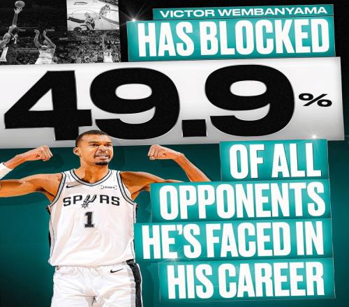 维克托·文班亚马短暂的职业生涯至今,他已经和547名对手同场竞技过,而其中有273 人(占比49.9%)都有被他至少封盖过一次。