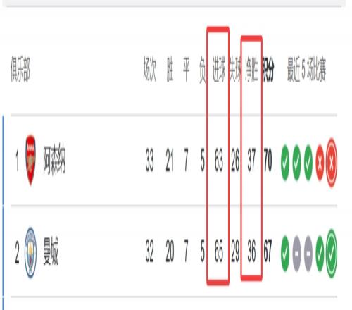 目前阿森纳净胜球37球、总进球63球;曼城净胜球36球、总进球65球。两队两项数据都极其接近。