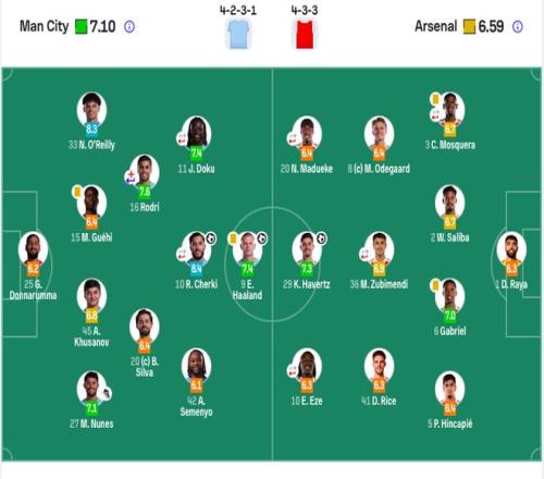 曼城首发:25-多纳鲁马、15-格伊、33-奥赖利、45-胡桑诺夫、27-努内斯、16-罗德里(88’14-尼科·冈萨雷斯)、20-B席、10-谢尔基(85’47-福登)、42-塞梅尼奥、11-多库(88’26-萨维尼奥)、9-哈兰德。